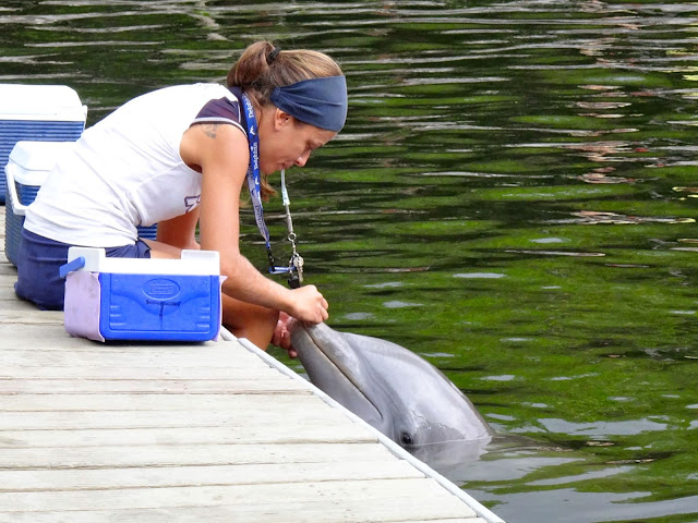 一进门就是与海豚游泳的地方。每次表演结束她都会得到一块鱼肉,和教练小姐的按摩。