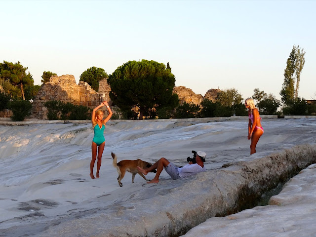 如果不是因为身体还处于10个钟头以外的时区,我怎么可能做到清晨5点多就精神抖擞地出门了。棉花堡和小镇还在睡梦中,游人没几个,估计都是和我一样在倒时差。起得比鸡早的狗狗在到处寻找人类的爱抚,肆无忌惮地调戏着红绿泳衣毛豆。